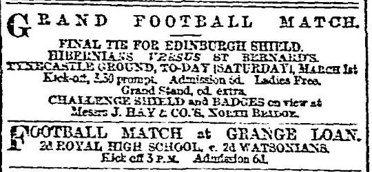 | Sat 01 Mar 1884 Boness 3 Hearts 2 Sat 01 Mar 1884 Hibs 7 St Bernards 0 |