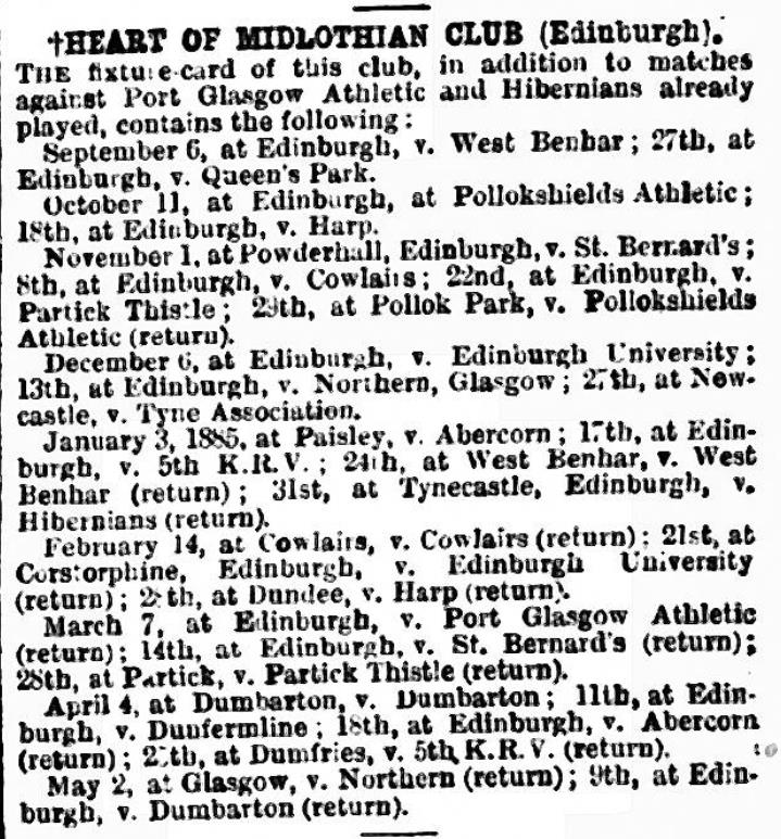 | Sat 06 Sep 1884 Hearts 4 West Benhar 3 Sat 06 Sep 1884 Hibernian 2 Queens Park 4 |