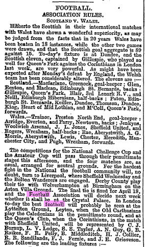 | Sat 21 Mar 1896 Scotland 4 Wales 0 Sat 21 Mar 1896 Hibernian 0 Hearts 1 |