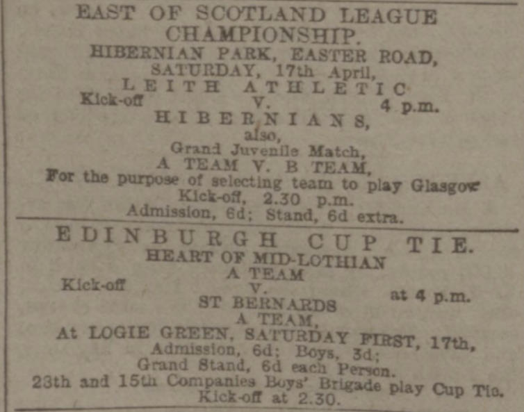 | Sat 17 Apr 1897 Newcastle United 3 Hearts 0 Sat 17 Apr 1897 Hibernian 1 Leith Athletic 0 |