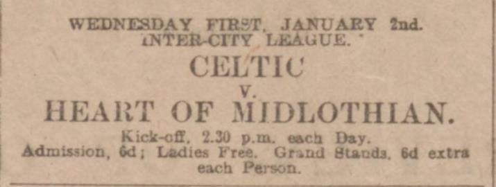 | Wed 02 Jan 1901 Celtic 3 Hearts 2 Wed 02 Jan 1901 Rangers 2 Hibernian 1 |