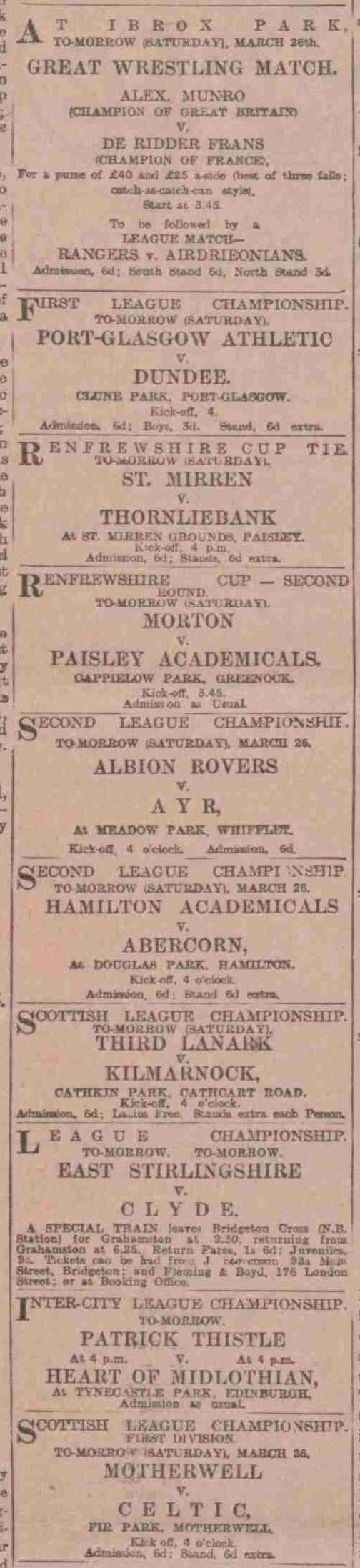 | Sat 26 Mar 1904 Ireland 1 Scotland 1 Sat 26 Mar 1904 Hearts 4 Partick Thistle 0 Sat 26 Mar 1904 Hibernian 2 St Mirren 1 |