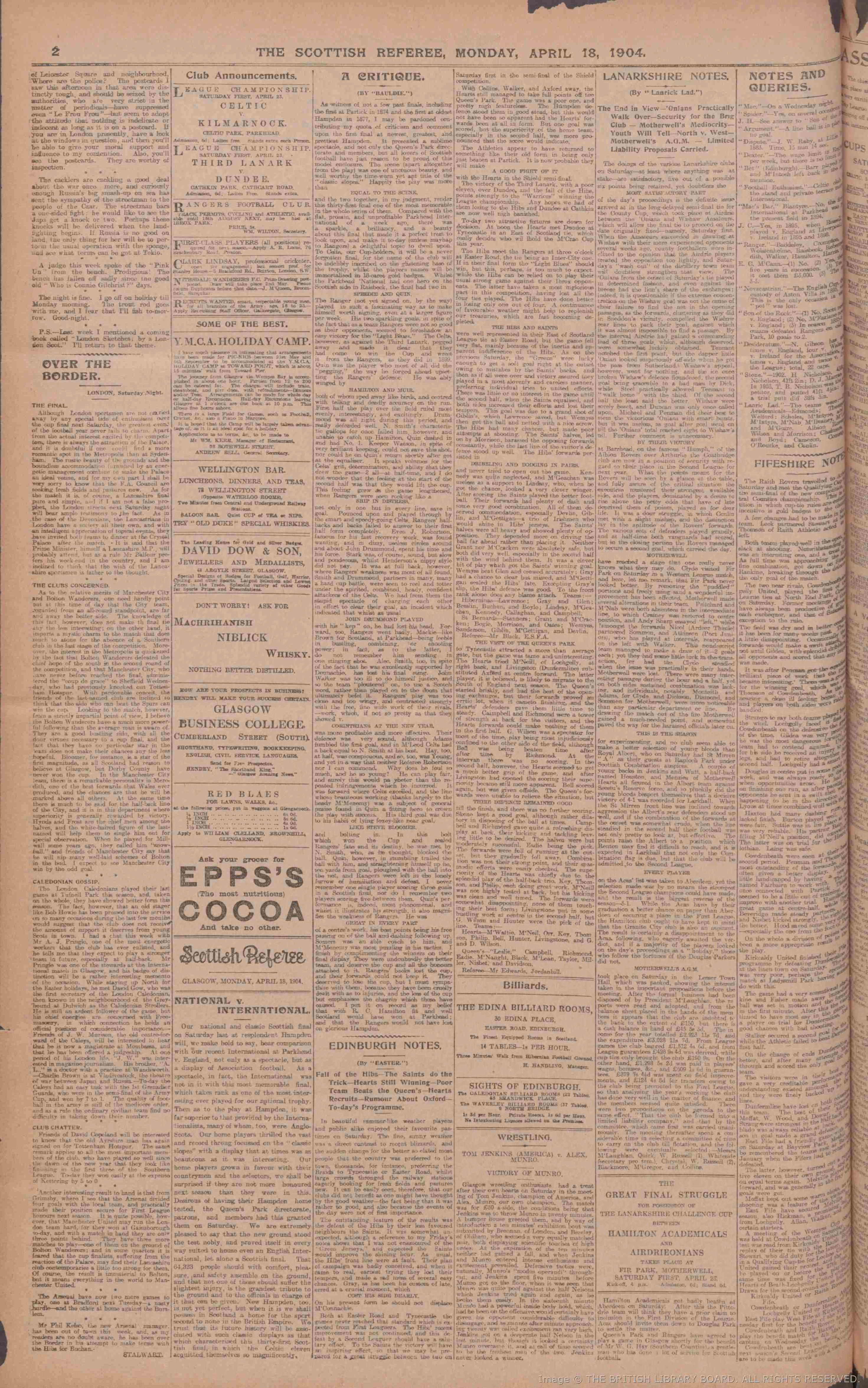 | Sat 16 Apr 1904 Celtic 3 Rangers 2 Sat 16 Apr 1904 Hearts 1 Queens Park 0 Sat 16 Apr 1904 St Bernards 1 Hibernian 2 |