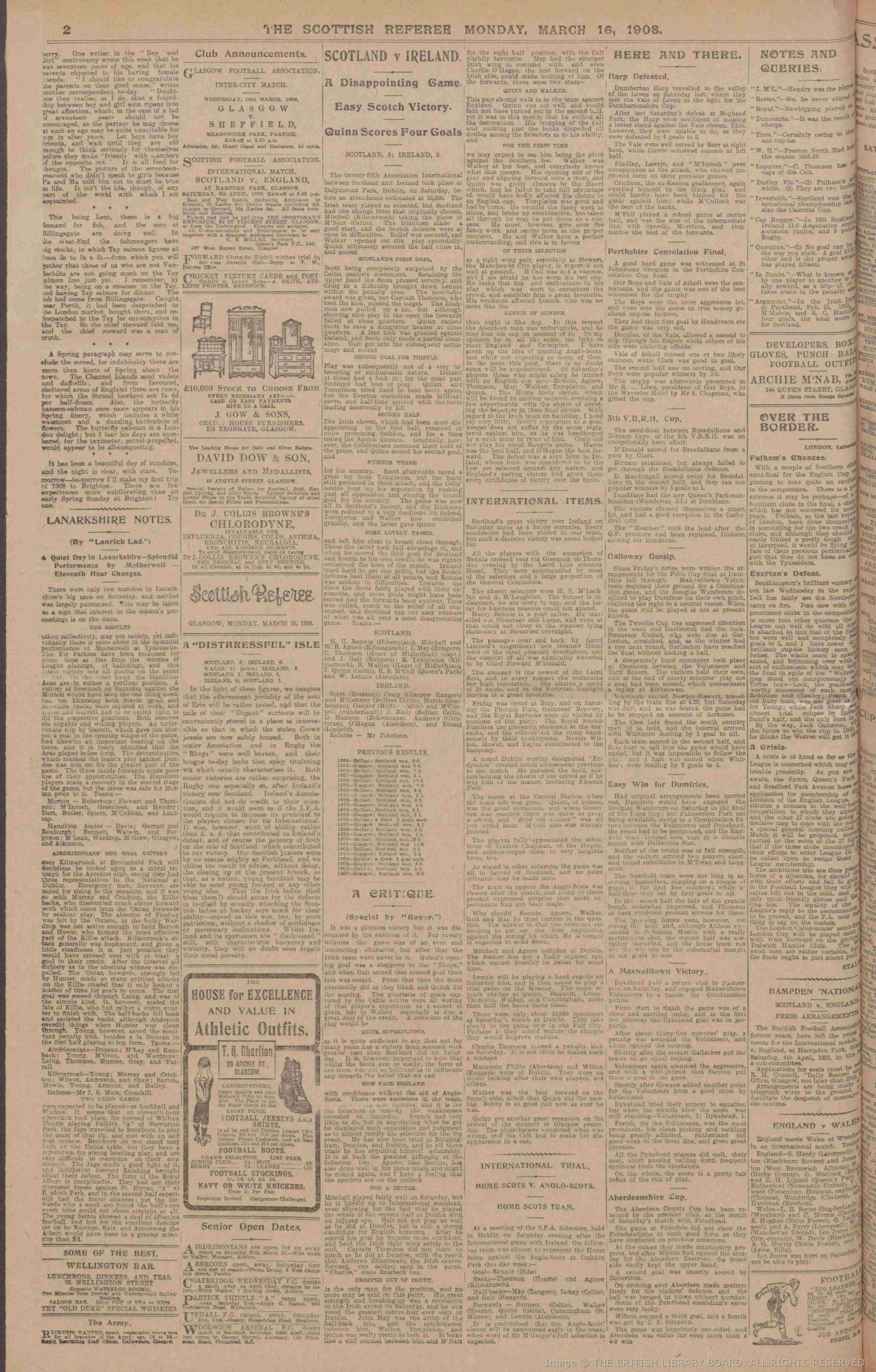 | Sat 14 Mar 1908 Ireland 0 Scotland 5 Sat 14 Mar 1908 Hearts 0 Motherwell 3 Sat 14 Mar 1908 Falkirk 3 Hibernian 1 |