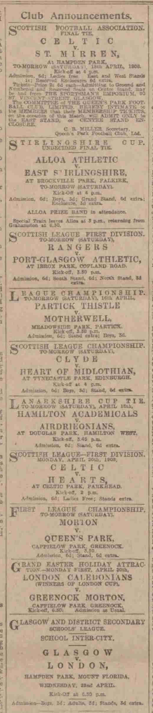 | Sat 18 Apr 1908 Celtic 5 St Mirren 1 Sat 18 Apr 1908 Hearts 1 Clyde 0 Sat 18 Apr 1908 Aberdeen 1 Hibernian 1 |