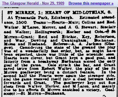 | Sat 27 Nov 1909 Hearts 0 St Mirren 1 | |||||||