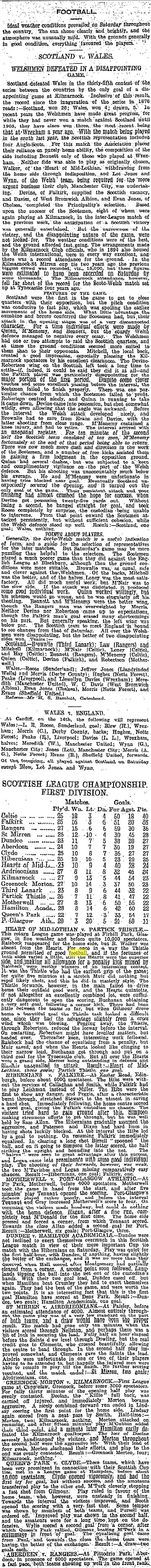| Sat 05 Mar 1910 Scotland 1 Wales 0 Sat 05 Mar 1910 Partick Thistle 1 Hearts 3 Sat 05 Mar 1910 Hibernian 1 Falkirk 1 |