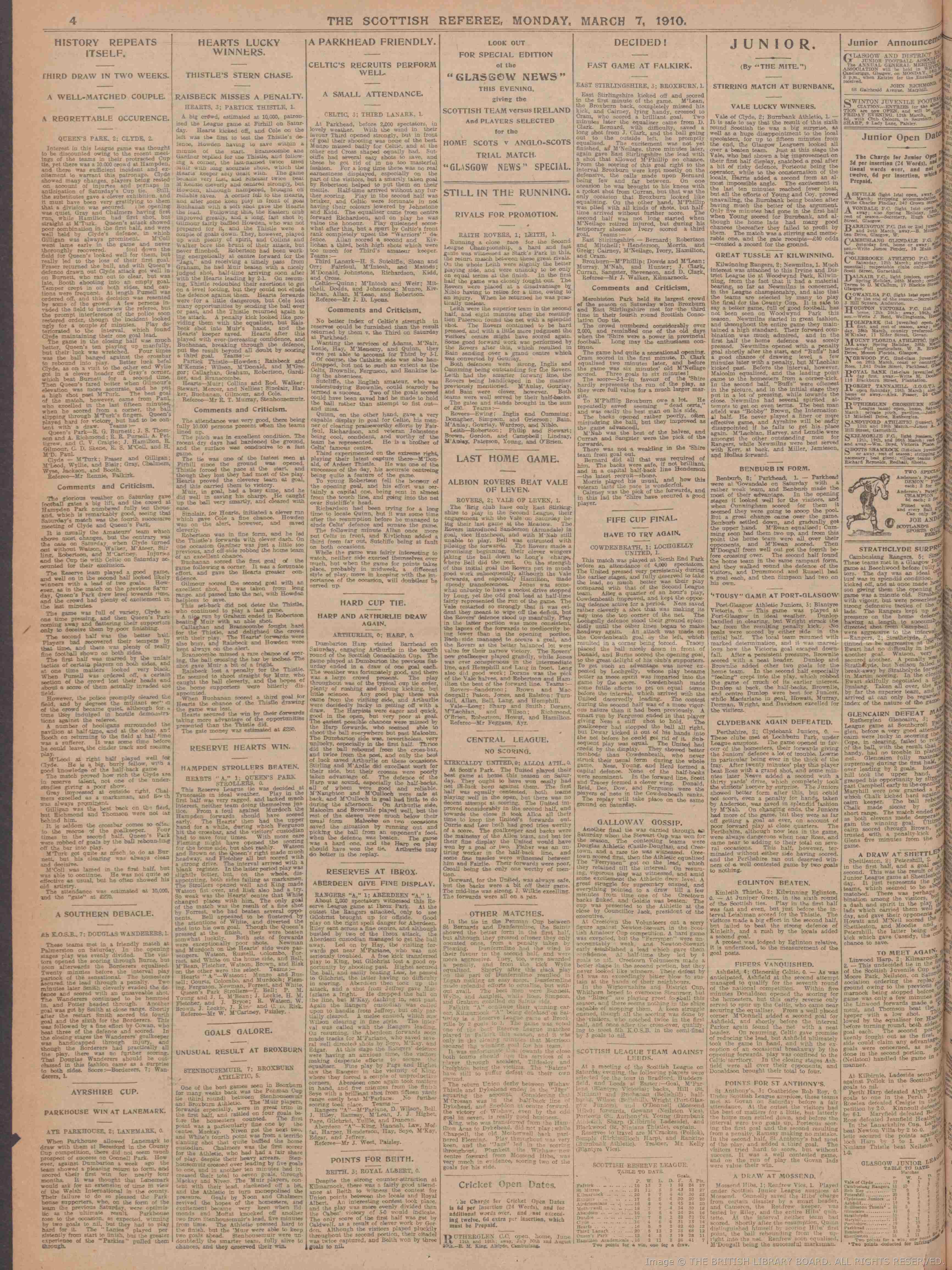 | Sat 05 Mar 1910 Scotland 1 Wales 0 Sat 05 Mar 1910 Partick Thistle 1 Hearts 3 Sat 05 Mar 1910 Hibernian 1 Falkirk 1 |