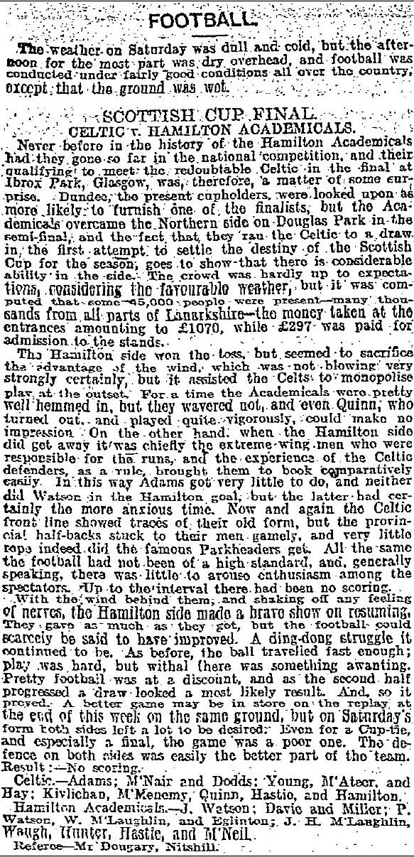 | Sat 08 Apr 1911 Celtic 0 Hamilton Academical 0 Sat 08 Apr 1911 Hearts 3 St Bernards 1 Sat 08 Apr 1911 Aberdeen 1 Hibernian 1 |
