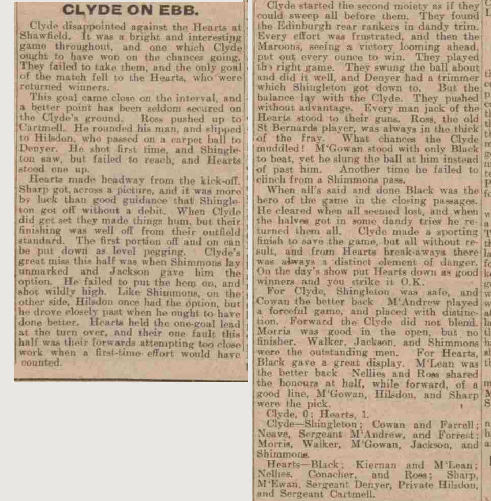 | Sat 17 Mar 1917 Clyde 0 Hearts 1 | |||||||