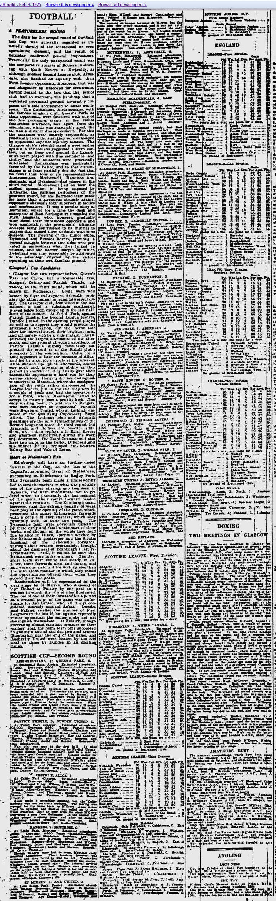 | Sat 07 Feb 1925 Kilmarnock 2 Hearts 1 Sat 07 Feb 1925 Hibernian 5 Third Lanark 1 |