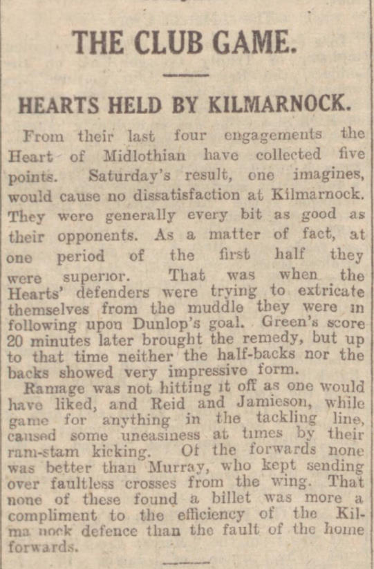 | Sat 14 Mar 1925 Hearts 1 Kilmarnock 1 | |||||||