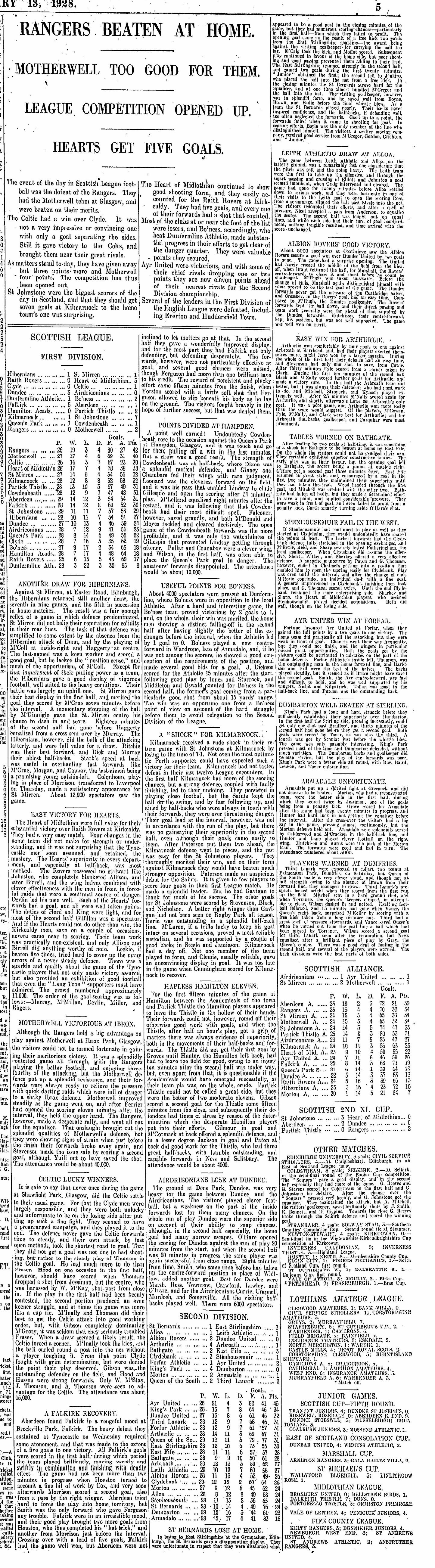 | Sat 11 Feb 1928 Raith Rovers 0 Hearts 5 Sat 11 Feb 1928 Hibernian 1 St Mirren 1 |