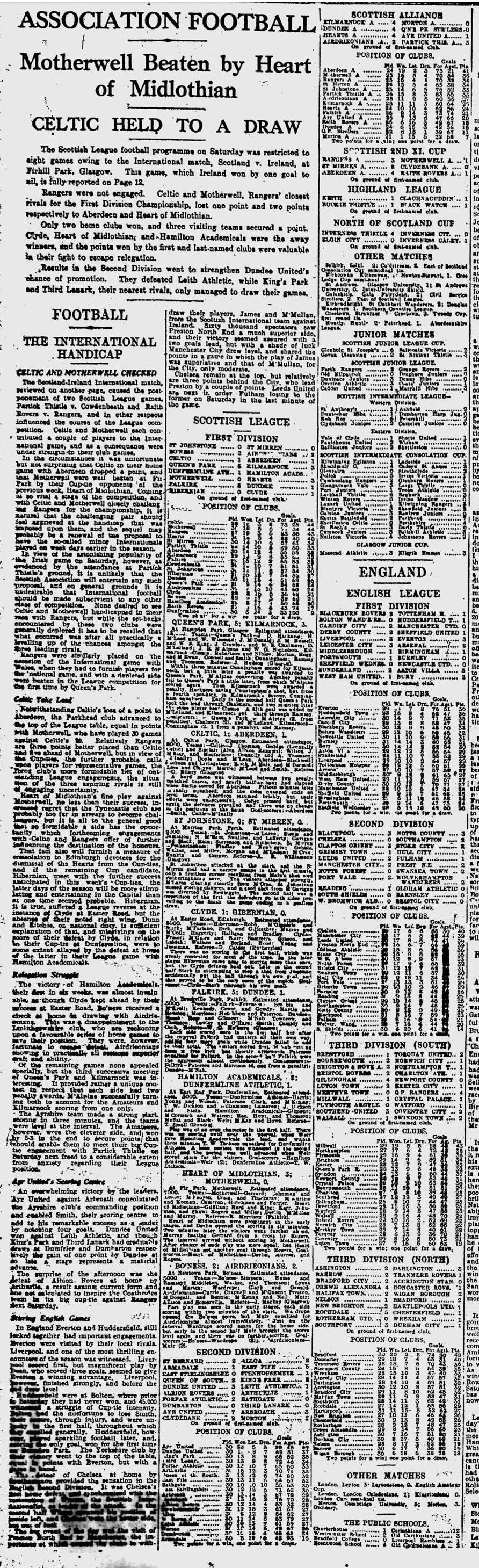 | Sat 25 Feb 1928 Scotland 0 Northern Ireland 1 Sat 25 Feb 1928 Motherwell 0 Hearts 3 Sat 25 Feb 1928 Hibernian 0 Clyde 1 |