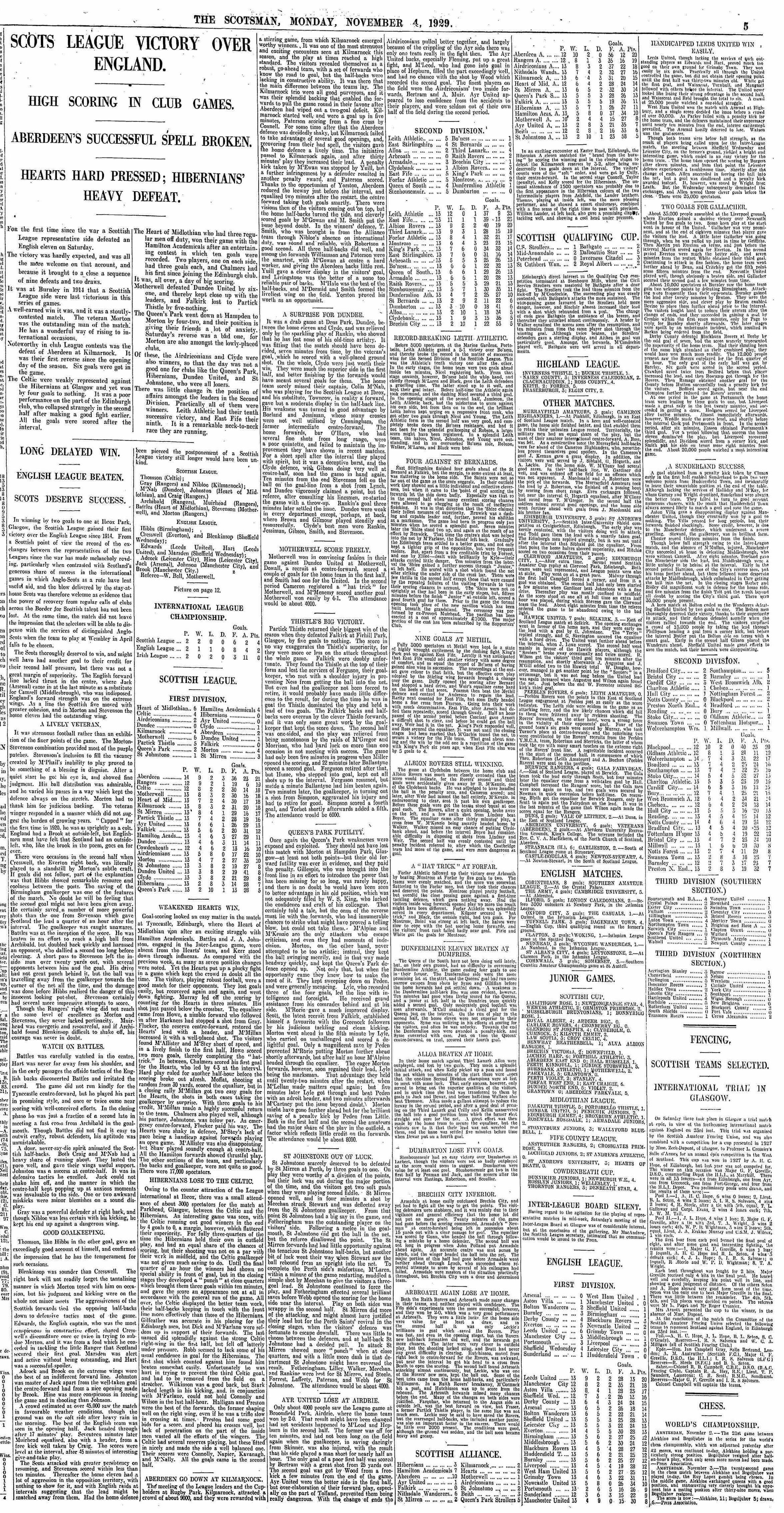 | Sat 02 Nov 1929 Hearts 6 Hamilton Academical 4 Sat 02 Nov 1929 Celtic 4 Hibernian 0 Sat 02 Nov 1929 SFL 2 English Football League 1 |