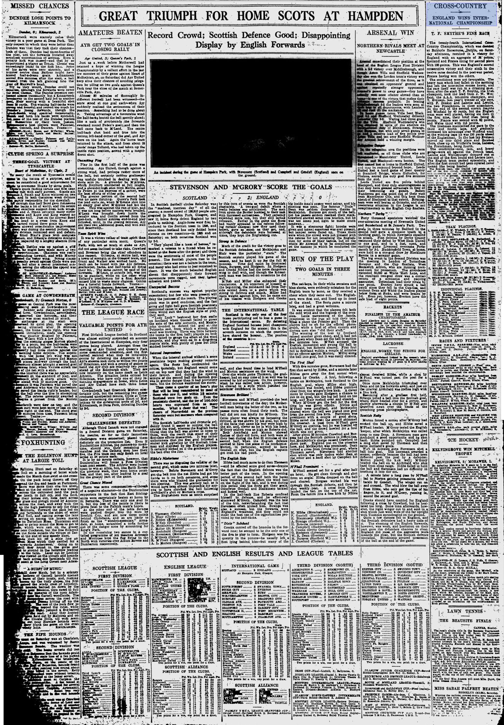 | Sat 28 Mar 1931 Scotland 2 England 0 Sat 28 Mar 1931 Hearts 0 Clyde 3 Sat 28 Mar 1931 Hibernian 4 Raith Rovers 0 |