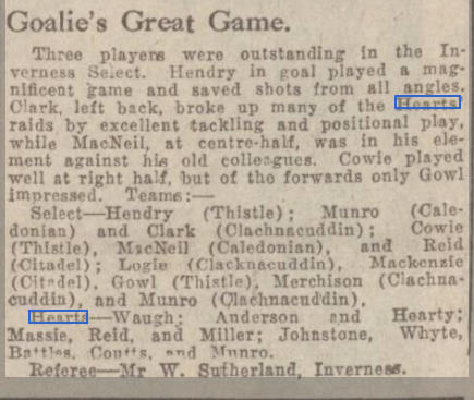 | Mon 23 Apr 1934 Inverness Select 1 Hearts 4 | |||||||