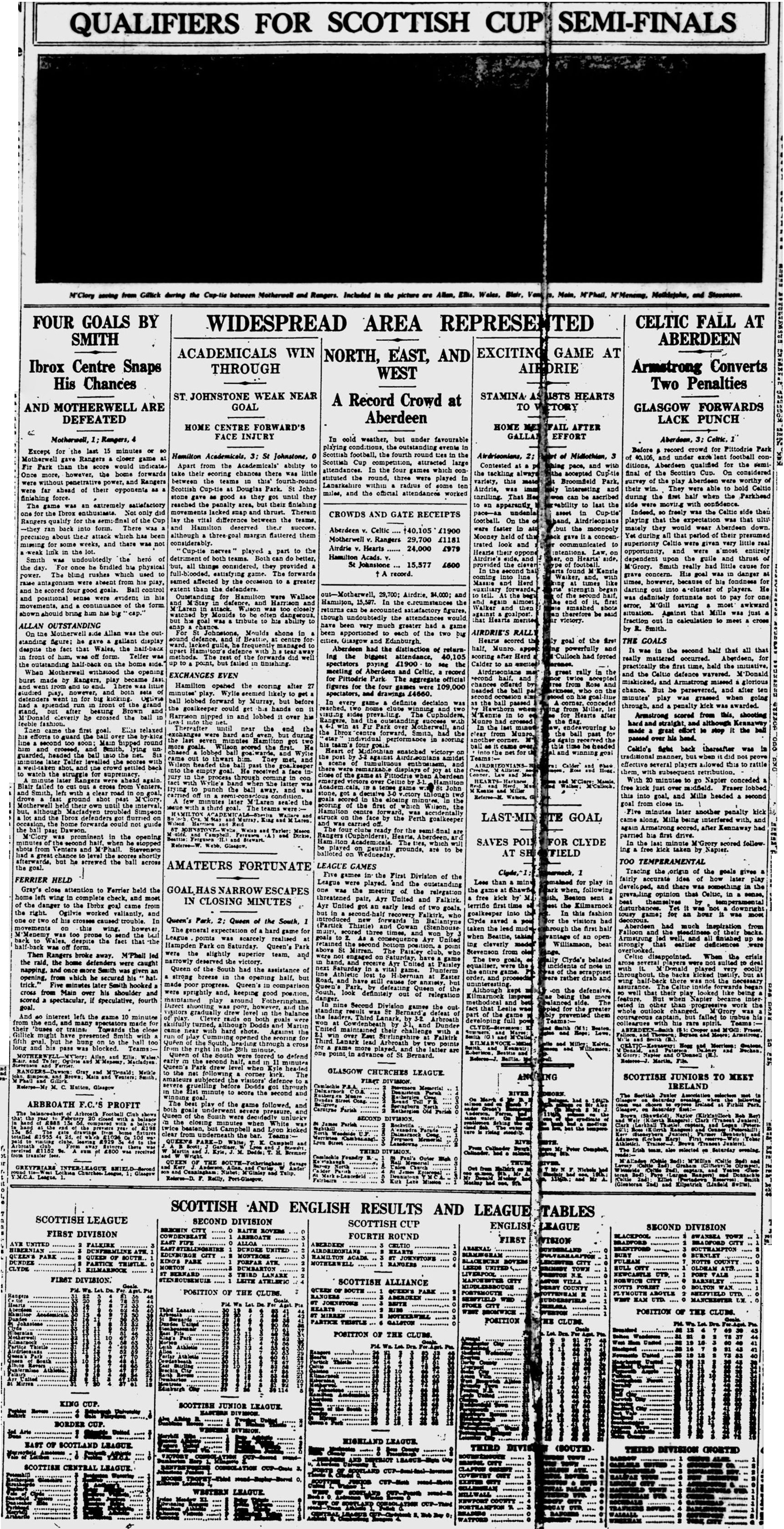 | Sat 09 Mar 1935 Airdrieonians 2 Hearts 3 Sat 09 Mar 1935 Hibernian 3 Dunfermline Athletic 1 |