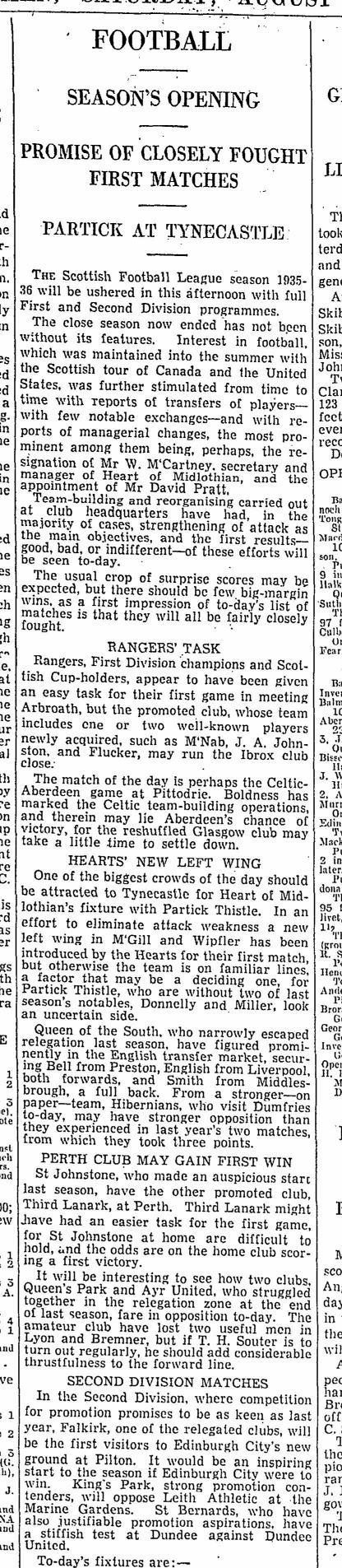 | Sat 10 Aug 1935 Hearts 2 Partick Thistle 0 Sat 10 Aug 1935 Queen of the South 1 Hibernian 1 |