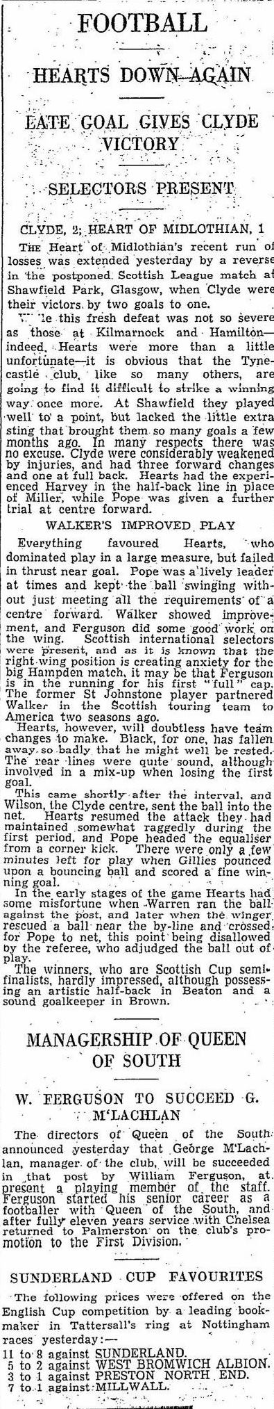 | Tue 23 Mar 1937 Clyde 2 Hearts 1 | |||||||