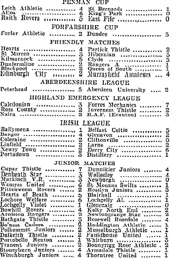 | Sat 07 Oct 1939 Hearts 4 Partick Thistle 2 Sat 07 Oct 1939 St Mirren 3 Hibernian 3 |