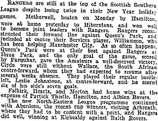 | Tue 02 Jan 1945 Hearts 4 Hamilton Academical 2 Tue 02 Jan 1945 Motherwell 3 Hibernian 0 |