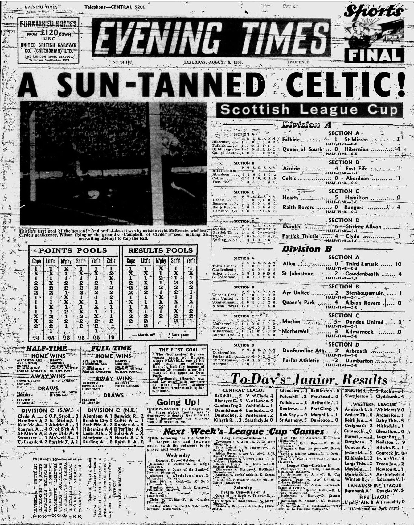 | Sat 08 Aug 1953 Hearts 5 Hamilton Academical 0 Sat 08 Aug 1953 Queen of the South 0 Hibernian 4 |