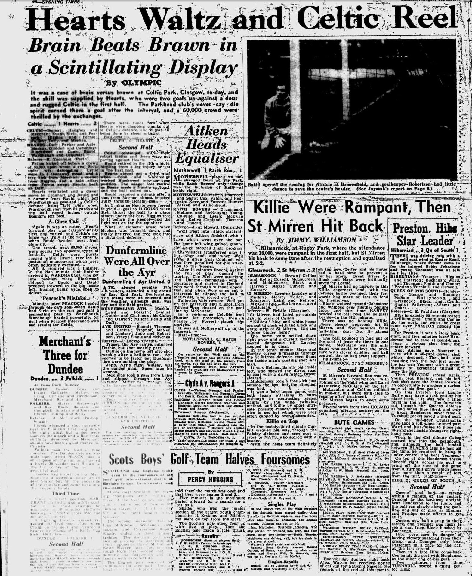 | Sat 21 Aug 1954 Celtic 1 Hearts 2 Sat 21 Aug 1954 Hibernian 3 Queen of the South 1 |