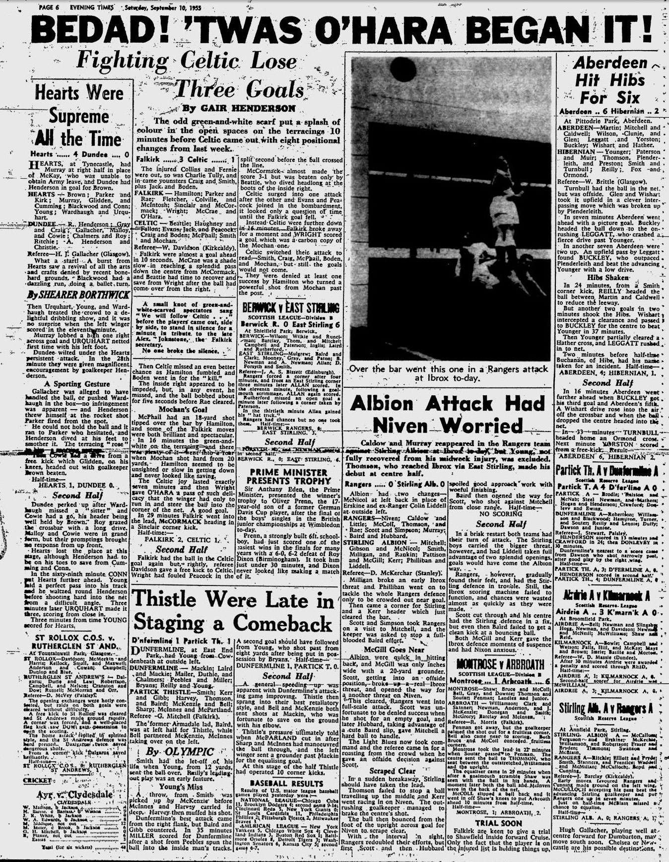 | Sat 10 Sep 1955 Hearts 4 Dundee 0 Sat 10 Sep 1955 Aberdeen 6 Hibernian 2 |