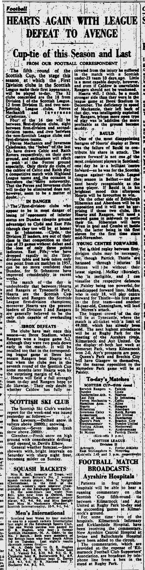 | Sat 02 Feb 1957 Hearts 0 Rangers 4 Sat 02 Feb 1957 Hibernian 3 Aberdeen 4 |