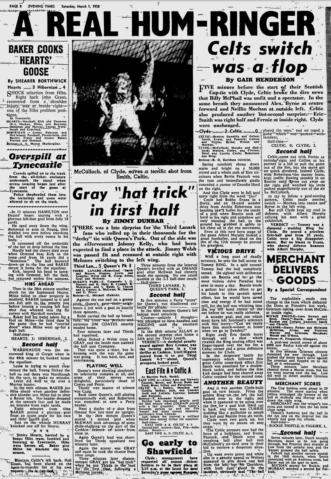 | Sat 01 Mar 1958 Hearts 3 Hibernian 4 | |||||||