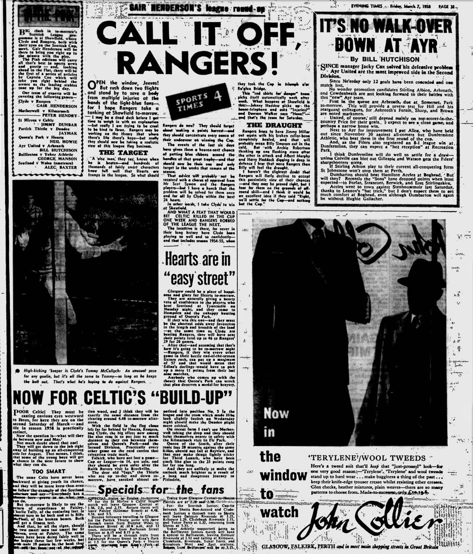 | Sat 08 Mar 1958 Queens Park 1 Hearts 4 | |||||||