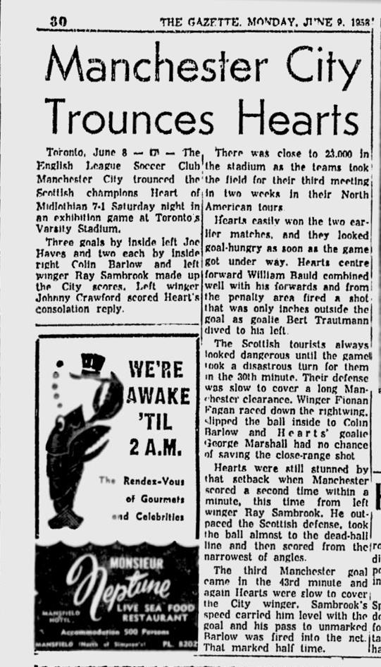 | Sat 07 Jun 1958 Manchester City 7 Hearts 1 | |||||||