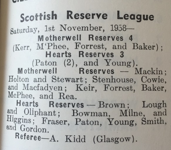 | Sat 01 Nov 1958 Hearts 0 Motherwell 2 | |||||||