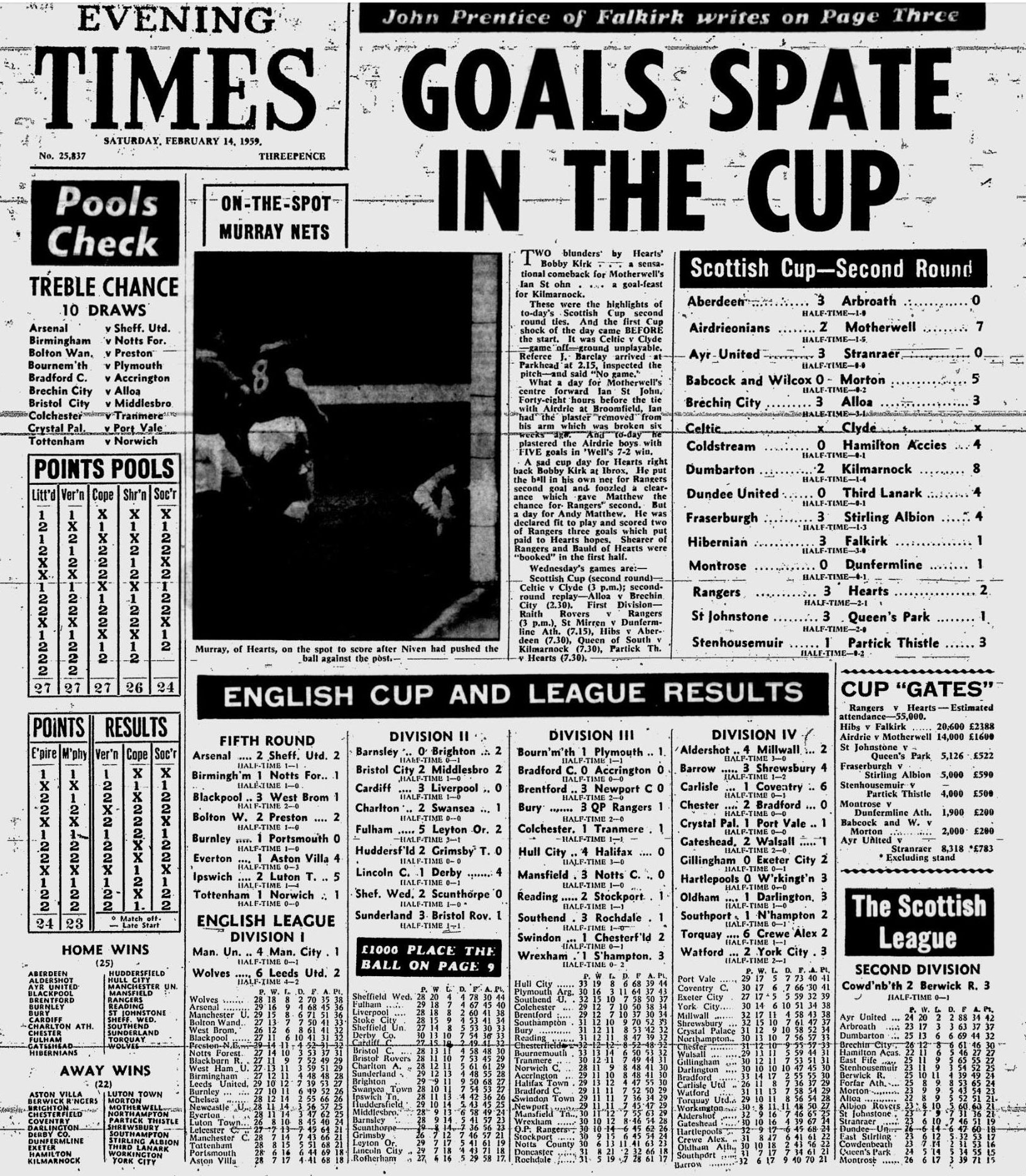 | Sat 14 Feb 1959 Rangers 3 Hearts 2 Sat 14 Feb 1959 Hibernian 3 Falkirk 1 |
