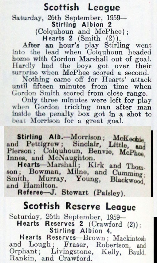 | Sat 26 Sep 1959 Stirling Albion 2 Hearts 2 | |||||||