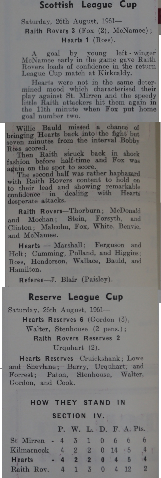 | Sat 26 Aug 1961 Raith Rovers 3 Hearts 1 | |||||||