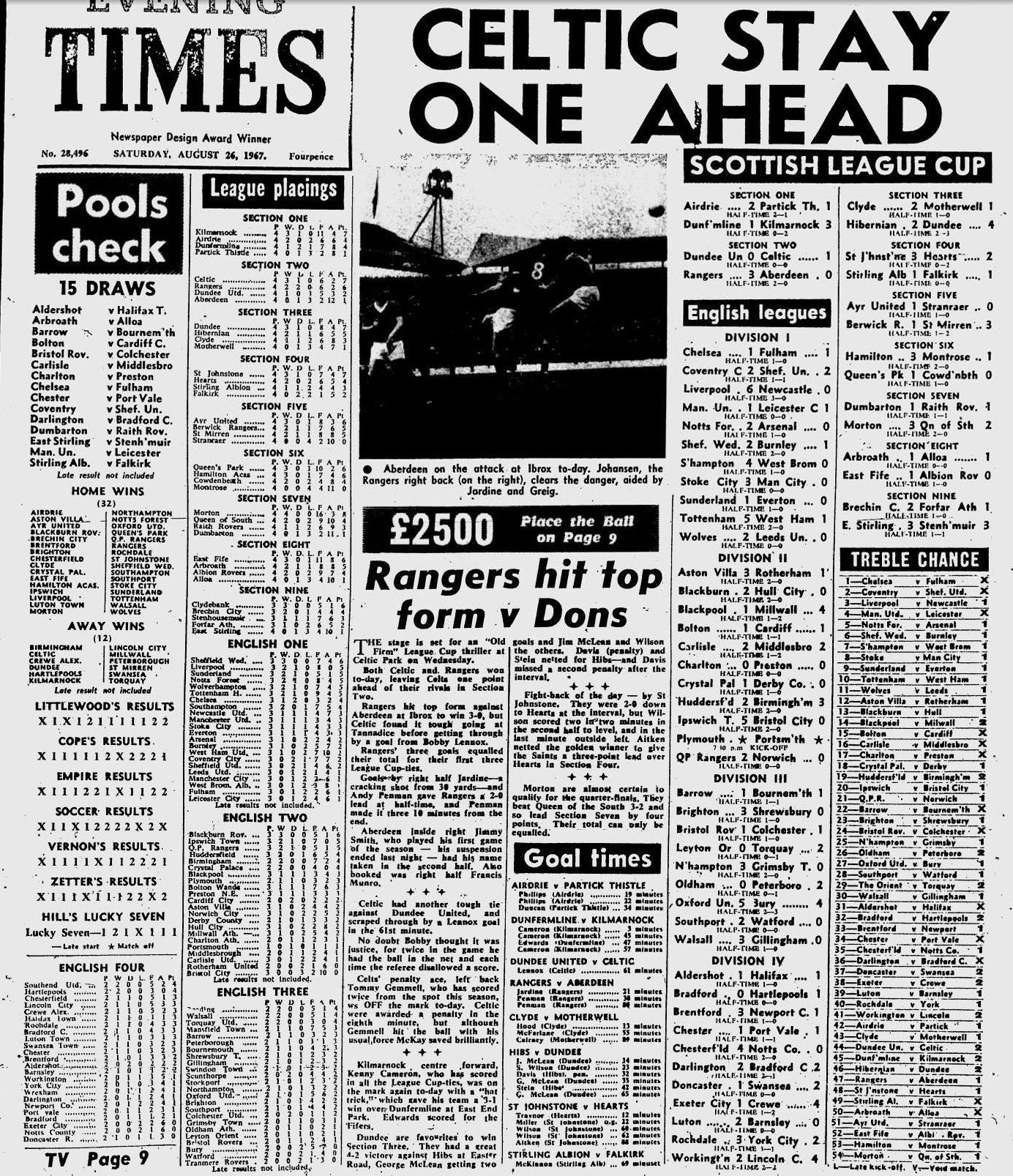 | Sat 26 Aug 1967 St Johnstone 3 Hearts 2 Sat 26 Aug 1967 Hibernian 2 Dundee 4 |