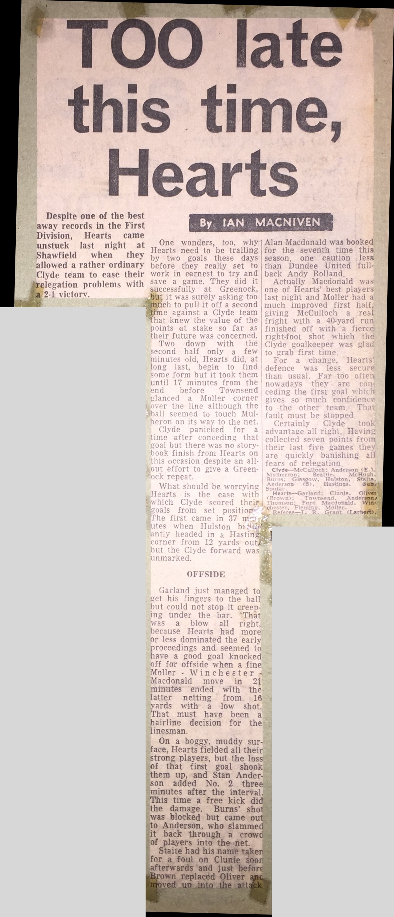 | Tue 16 Dec 1969 Clyde 2 Hearts 1 | |||||||