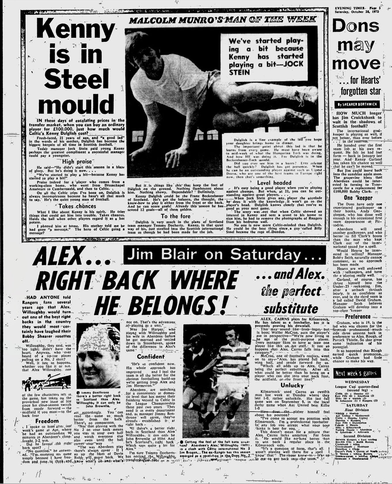 | Sat 28 Oct 1972 Hearts 3 Arbroath 0 Sat 28 Oct 1972 Dumbarton 2 Hibernian 2 |