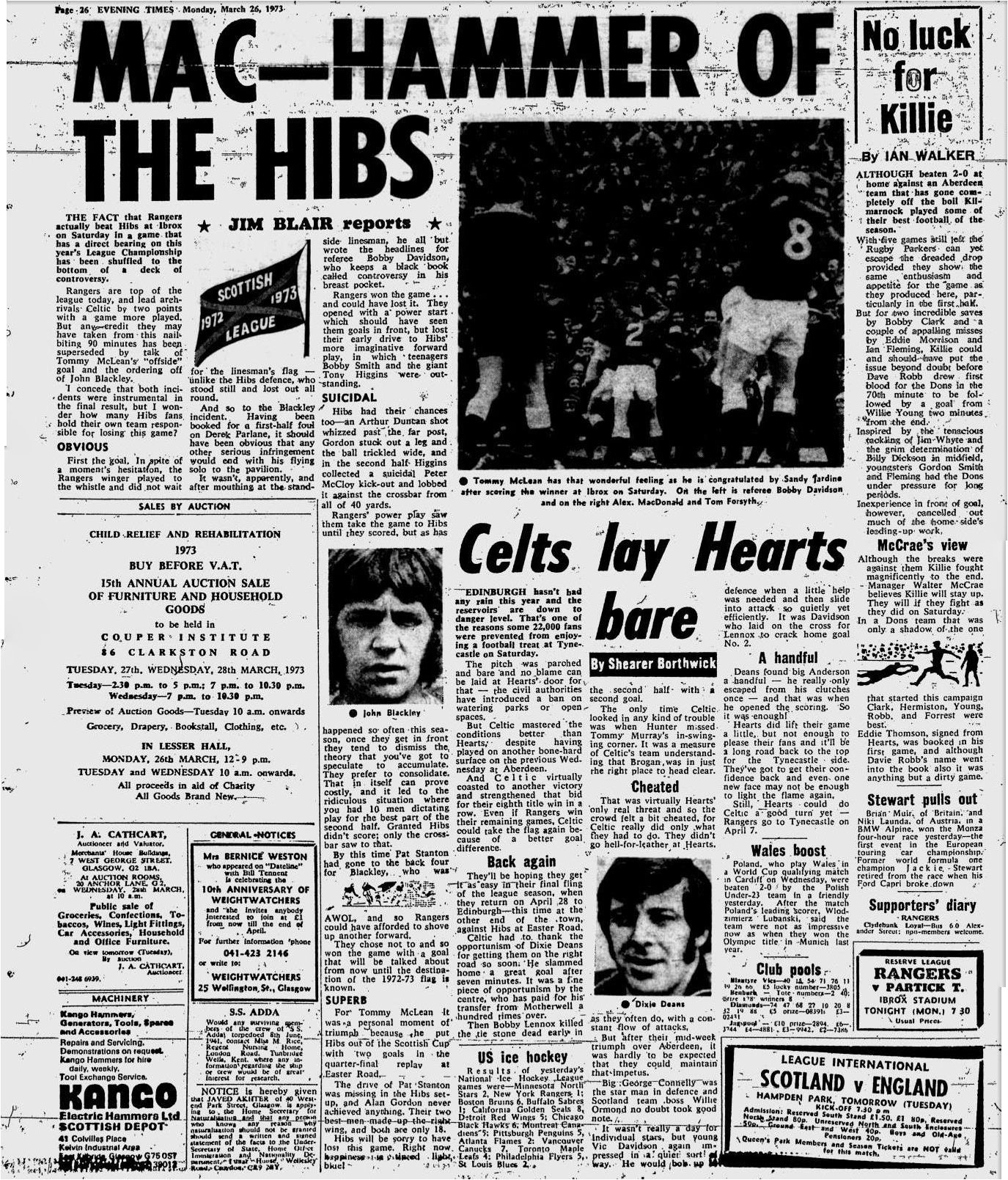 | Sat 24 Mar 1973 Hearts 0 Celtic 2 Sat 24 Mar 1973 Rangers 1 Hibernian 0 |
