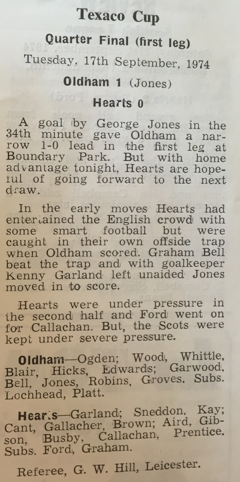 | Tue 17 Sep 1974 Oldham Athletic 1 Hearts 0 | |||||||