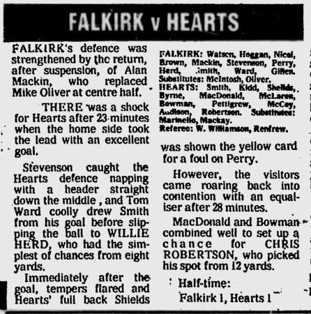 | Sat 06 Mar 1982 Falkirk 3 Hearts 1 | |||||||