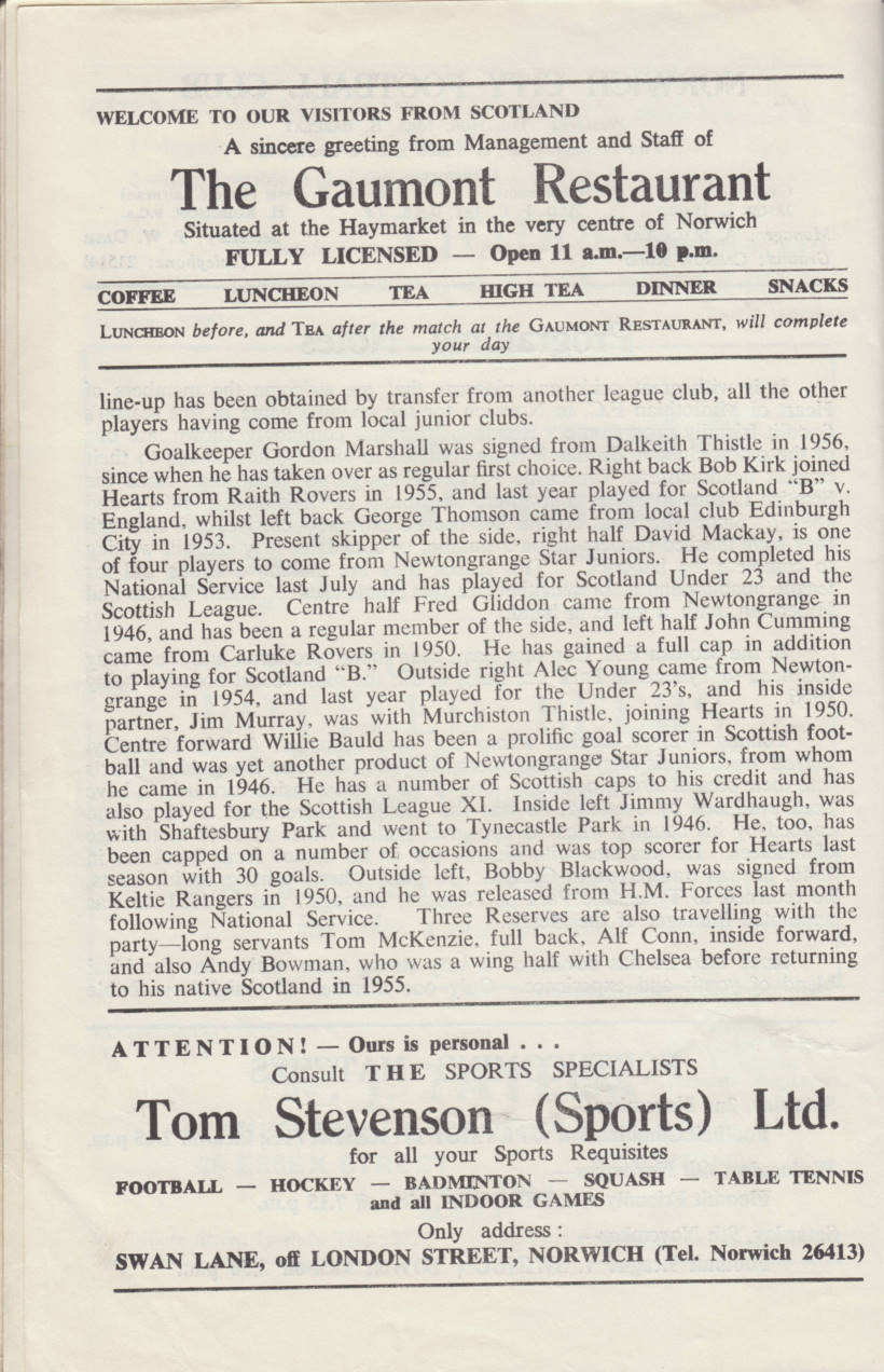 Wed 30 Oct 1957 Norwich City 3 Hearts 4